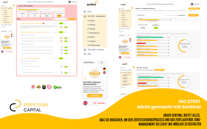 ISO 27001-Konformität nach Swiss made. Vergleichen Sie Ihre aktuelle Sicherheitslage mit der Norm, Ihre Hilfe für eine schnellere und reibungslosere ISO 27001-Zertifizierung und ISO 27001-Auditbegleitung (SoA)